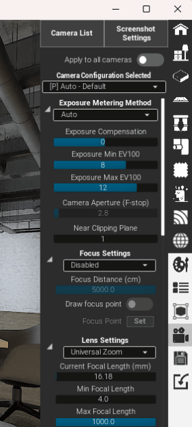 | Exposes all the detailed menus needed to edit a room ![]() Example) You can duplicate cameras, and configure detailed camera parameters for each camera. ![]() |